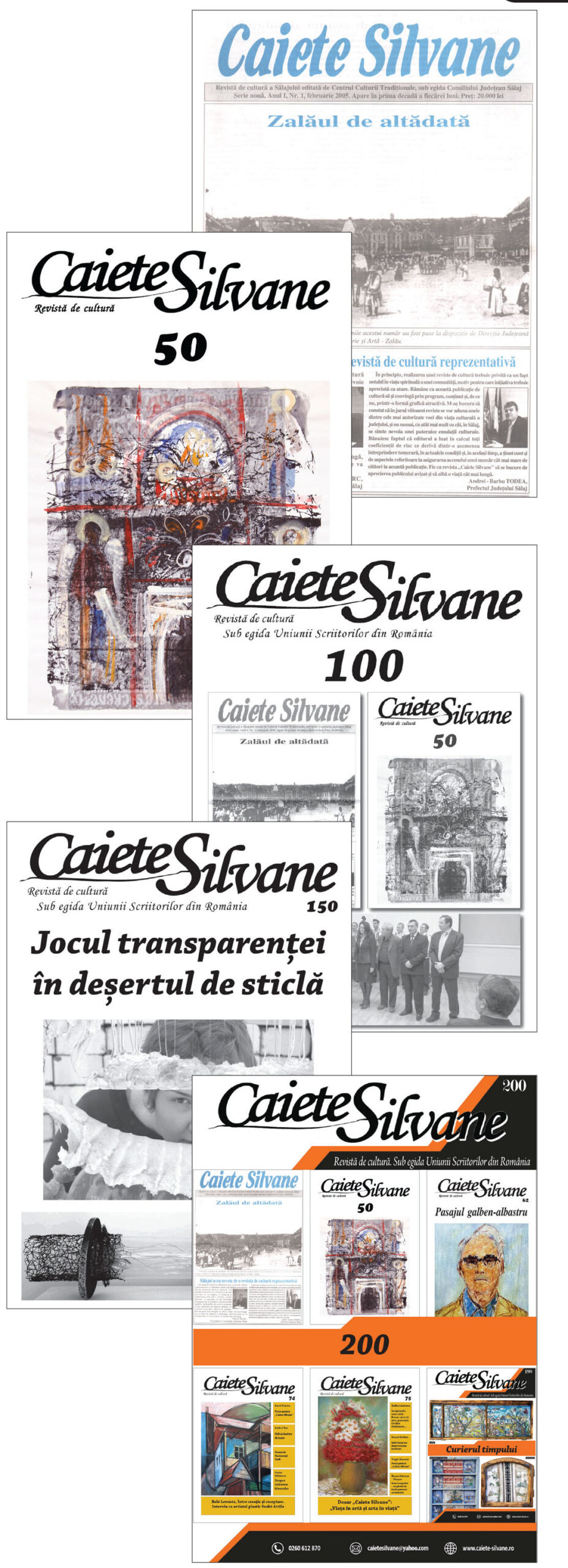 ■ La numărul 250 pot și să anunț că protocolul pentru editarea „Caiete Silvane” a fost reînnoit pentru încă cinci ani, așadar până în 2030. Parteneri: Consiliul Județean Sălaj; Instituția Prefectului Județul Sălaj; Primăria Municipiului Zalău; Direcția Județeană pentru Cultură Sălaj; Muzeul Județean de Istorie și Artă Zalău; Universitatea de Vest „Vasile Goldiș” Filiala Zalău; Biblioteca Județeană „Ioniță Scipione Bădescu” Sălaj; Inspectoratul Școlar Județean Sălaj; Arhivele Naționale Filiala Sălaj; Cenaclul literar „Silvania” și Centrul de Cultură și Artă al Județului Sălaj.